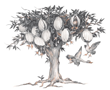 Чудо из чудес, вместо плодов всяких гусей живых родит. Когда подходящий час подоспеет, дерева сего ветки густейше ракушками обвешиваются, ровно яблонь яблоками. Ракушки оные взрастают, а затем скорлупка их лопается и раскрывается. Ежели кто поблизости пребывает, тот видит, как из скорлупы той раскрытой птичьи ноги перепончатые, дергаясь потешно, висят, а вскорости и цельные птицы гогоча из скорлупы вылупляются, совсем выросшие и к летанию готовые. Птицы сии, берниклями называемые[1], размером гусей поменее, а уток поболее будут.