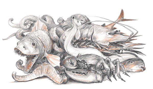 Многочисленны, как говорит Давид в псалме 104:25: «Это море великое и пространное; там пресмыкающиеся, которым нет числа, животные малые с большими» («hoc mare magnum et spacionum manibus illic reptilia quorum»). Плиний же оных больших и малых перечисляет до сорока и четырех, а делит их на монстров, змей водных, крабов, раков, омаров, ракушек, полипов, камбал, ящериц и червей.