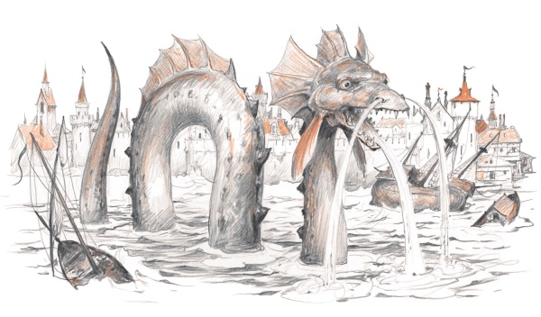 Сие есть гад преогромный, дракон водный с шеею зело длинною, мордою вытянутою и буркалами, аки карбункулы светящимися. Одного-единственного такового – хвала Провидению! – дано было человекам узреть в Нормандии в лето Господне 520 подле града Руана. Знать, из моря по реке Сене к граду приплыл, вынырнул и принялся водою жутко плеваться и рыгать – отсюда и название его от слова «garguiller»[2] происходит. Рыгал гаргулец и рыгал, весь град Руан водою залил и околичный край так обводнил, что и наисильнейший потоп вредов таких не наносил. Погибель глянула в глаза нормандцам, и скверно б их дела были, ежели бы не святой Роман, in illo tempore[3] епископ руанский, коий экзорцизмами гаргульца изгнал. И с тех пор его уже никто не видывал. Гаргульца, значит.