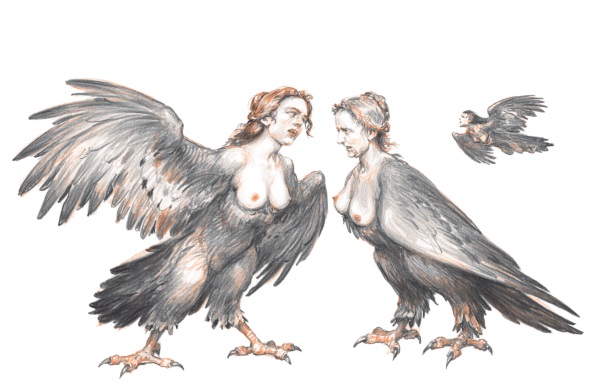 Весьма отвратная скотина, полуптица-полубаба. Известны (из истории об аргонавтах и их по Руно Златое странствии) гарпии, кои царя фракийцев Финея жестоко преследовали и, непрестанно по-над головою его кружась, уделывали его и все вокруг вонючими экскрементами так, что царь Финей ни откушать, ни отпить, ни спокойно почивать не мог. Тогда два аргонавта, сыны Борея Калаид и Зет, гарпий оных прочь прогнали.