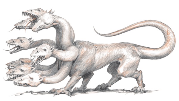 Есть чудовище грозное, гад, коего один только экземпляр осмиголовый, тот, что в болотах неоподаль города Лерна в Аркадии залегал, известен. Герой Геракл ту осьмиглавую лернейскую гидру убил, и был это его второй подвиг из двенадцати. И нелегок труд был сей, ибо на месте отрубленной головы тот же час вырастали две новые, откуда, кстати, пошло и ее латинское название Excedra[4]. В борьбе с оной на такую концепцию Геракл напал, чтобы, отрубив голову, тут же это место факелом прижигать. Помогло.