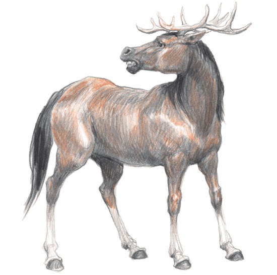 Есть, как по названию видно, полуконь-полуолень. Говорят, что в бестии сей конская и оленья натуры постоянно промежду собою борются, потому-то гиппоцерв есть животное зело нерешительное и чрезвычайно рассеянное.
