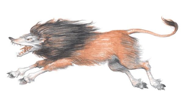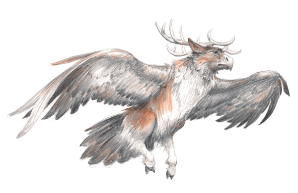 Говорят, сей зверь с материка Атлантиды происходит, гибель коей несколько штук этих перетерпело. Это полуолень-полуптица, ноги у него оленьи и голова оленьими рогами украшена, а к тому крылья преогромные и гузка густым перьем поросла. Зело враждебен перитон людям, и не один путник на совести его.