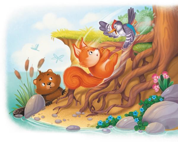 Он принялся стучать по земле прямо перед бельчонком. Камни и пыль полетели в разные стороны. Рыжик захлопал в ладоши от восторга, как вдруг вдоль берега поползла трещина, и край, на котором он стоял, начал обваливаться. Толя ухватил Рыжика за хвост, но бельчонок оказался слишком тяжёлым для птенца.