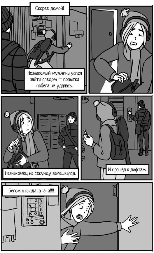Катин папа рассказывал, что в момент стресса человек либо становится сильнее и к нему возвращаются даже те знания, которые, казалось, он давно забыл, либо из головы вылетает всё нужное и полезное. С Катей, к её ужасу, случилось последнее. От волнения она совершенно забыла все правила безопасного поведения на улице, которым её учили родители. Девочка не придумала ничего лучше, как юркнуть в свой подъезд, но сразу же пожалела об этом: незнакомый мужчина успел зайти следом – попытка побега не удалась.