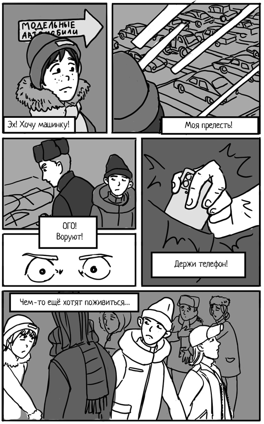 Усталость как рукой сняло. Забыв о наказе «не отставать», я свернул в отдел, обозначенный на неоновой стрелке. Ладно-ладно, про наказ я помнил, но ногам и сердцу не прикажешь – автомобили были моей страстью. Жёлтые «Ламборгини», красные «Феррари», аквамариновые BMW – они будто подмигивали мне отражённым от полированных боков светом ярких ламп торгового зала. Я оценивающим взглядом скользнул по каждой модели до самого конца автомобильного ряда, и тотчас нахмурился: белого лимузина «Линкольн», о котором я так мечтал, нигде не было – только зря пришёл. Расстроенно крутанувшись на пятках, я уже собирался выскочить из магазина, как вдруг, сам того не желая, стал свидетелем самого что ни на есть настоящего преступления: в соседнем отделе через аллею два подростка стянули из кармана мужчины мобильный телефон. Точнее, один из сообщников претворялся, что выбирает товар, но как только дело было сделано, преступники со скучающим видом вместе направились к выходу.