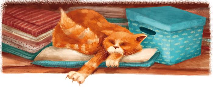 Кот мирно посапывал на стопке чистых простыней. При появлении Славика в дверях шкафа он лишь дёрнул ухом и с довольным выражением рыже-белой мордочки потянулся, растопырив когтистые пальцы на передних лапах.