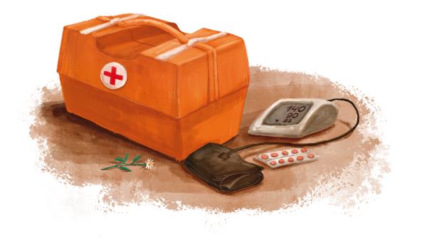 Когда Славик возвращался на шестой этаж, чтобы продолжить знакомство с соседями, во дворе дома послышалось протяжное «Виу-виу!». Через минуту домофон сообщил об открытии входной двери, и лифт повёз кого-то наверх. Спустя несколько секунд из него вышли взрослые в синих костюмах с белыми полосками на рукавах и штанинах. Один из них нёс оранжевый чемоданчик с красным крестом внутри белого кружочка. Произошло это как раз на шестом этаже.