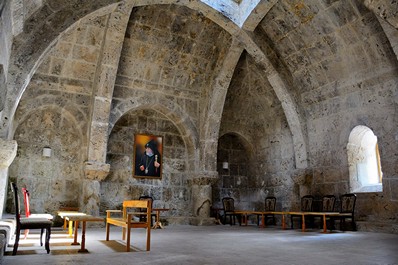 Трапезная являет собой – редкий образец архитектуры. Она была возведена зодчим Минасом в 1248 г. Помещение разделено на две квадратные в части, перекрытые системой перекрещивающихся арок. Вдоль стены проходят каменные скамьи, а на западном торце, возле двери – широкий арочный проем, предусмотренный для входа и выхода многочисленных паломников.