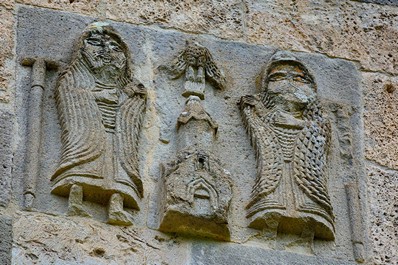 Не менее живописны рельефы восточной стены. Входы в небольшую молельню и церковь Аствацацин имеют прямоугольные обрамления, объединенные двумя рельефными крестами. На порталах молельни вырезаны очень распространенные в орнаментации и книжной миниатюре XIII века изображения сирина – фантастической птицы с женской головой в короне, а в церкви – человеческие фигуры с согнутыми в локтях руками, в длинных одеяниях и с нимбом вокруг головы. Не исключено, что эти фигуры принадлежат членам княжеской фамилии, связанным со строительством данных помещений.