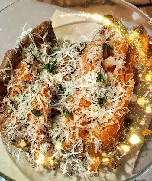 очень вкусный вариант приготовления батата. Запеченный сладкий картофель в духовке с сыром под пряным маслом.