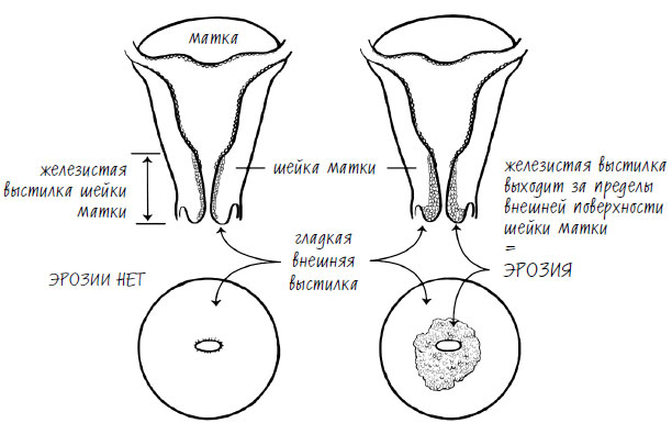 Давайте я попробую объяснить… Обычно поверхность шейки матки полностью покрыта гладкой выстилкой, она довольно плотная и напоминает кожу, покрывающую внутреннюю поверхность влагалища, но текстура железистой выстилки немного грубее, и при этом она довольно хрупкая. Именно она выделяет большую часть защитного отделяемого, о котором я рассказываю в Главе 6. Чаще всего эрозия возникает у женщин, принимающих комбинированные оральные контрацептивы, или во время беременности, но у огромного числа женщин эрозия возникает без какой-либо причины. Наличие эрозии не означает, что у таких женщин будет плохой мазок или они чем-то больны. Тем не менее эрозия шейки матки может доставлять массу неудобств. Эрозии кровят при контакте – например, после взятия мазка или во время/после секса, потому что железистая выстилка сама по себе очень хрупкая. Это не значит, что с вами что-то не так, просто выстилка шейки не создана для таких воздействий. К слову, многие женщины даже не подозревают о том, что у них эрозия, потому что кровянистых выделений у них нет. Если у вас эрозия, она может пройти сама собой, особенно в том случае, если вы принимаете противозачаточные таблетки – эрозия проходит, когда вы бросаете их пить. Но если кровянистые выделения доставляют вам неудобство, есть способ восстановления железистой выстилки, например, прижигание, которое рекомендует множество вэб-сайтов.