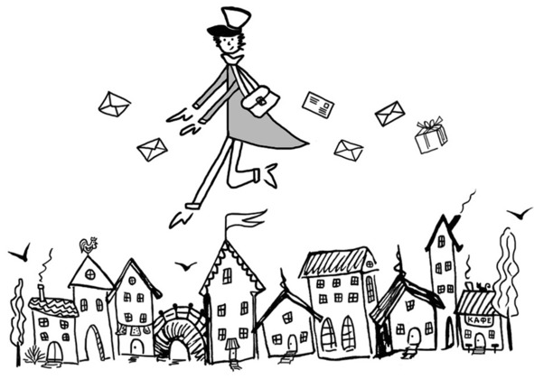 Городская площадь вновь опустела, но ненадолго. Вон в одном из её концов замаячила долговязая фигура. Она лихо перемещалась на своих худых длиннющих ножках от одного порога дома к другому. Вжик-вжик! Вжик-вжик! Кто же это? Знакомьтесь – это дружище Жан, городской почтальон. Как видите, сейчас он занят и не может пожать вам руку. Ему надо быстро разнести всю сумку с почтой.