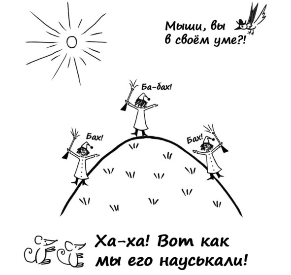 – Дёргайте Чёрного Господина за все усы без разбору! – повелел дедушка Мышь. – Вон он какие себе пышные усы отрастил. Ох, ещё и одеколоном напрыскал! Ох, сейчас я чихну… ох, не удержусь… ох, чихну…