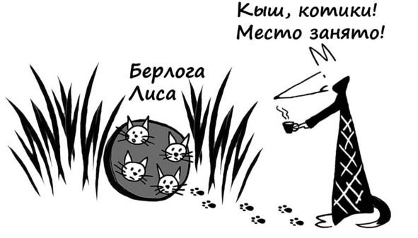 Увы, на закате их выгнали и отсюда. В берлогу пролез худющий старый лис Филимон. Увидел он незваных гостей и как давай их по усам своим рыжим хвостом охаживать да приговаривать: «Занято! Занято!»