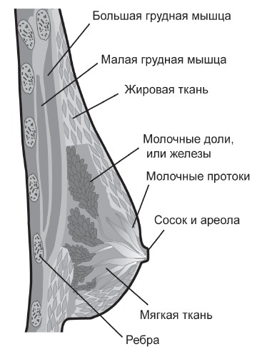 Структурную основу, «скелет», молочной железы создает поверхностная фасция (соединительнотканная оболочка). Расщепляясь на два листа, она образует своеобразный мешок (фасциальный футляр), в котором заключена паренхима (собственно тело) железы. От листов капсулы в глубь железы отходят соединительно-тканные перегородки, разделяющие железу на 15–20 долек, из которых формируются крупные доли (рис. 1).