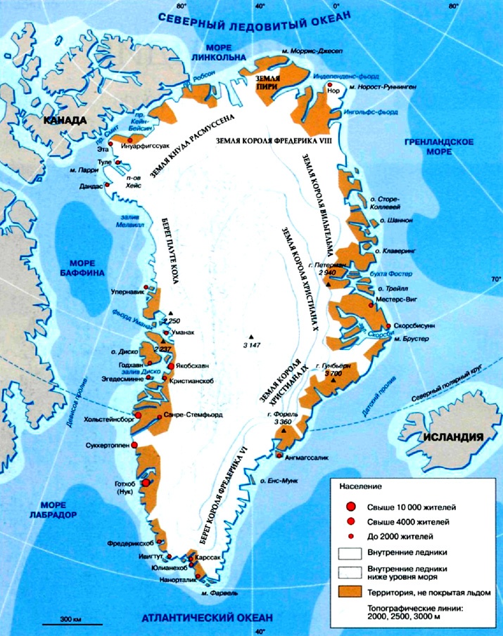 Гренландия – самый большой остров в мире. Он почти полностью покрыт ледниками. Здесь всегда холодно. Это страна снега и айсбергов.