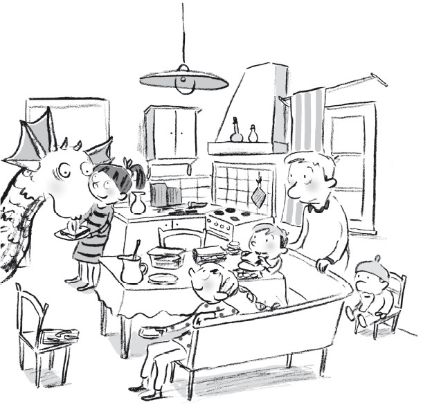 Папин дракон сидел в сторонке и пытался съëжиться, чтобы занимать меньше пространства. Это было с его стороны очень предусмотрительно – и совершенно безнадëжно. Его звали Хэнк, и он принадлежал к виду синих драконов, которые, как известно, отличаются довольно крупными размерами. Поэтому Хэнк занимал бóльшую часть кухни. Длиной он был с два дивана – а толщиной с один. Из-за этого между папой и его волшебным существом постоянно возникали споры. Папа считал, что столь крупному дракону следует хотя бы стараться не толстеть. А Хэнк считал, что на свете нет ничего вкуснее булочек.