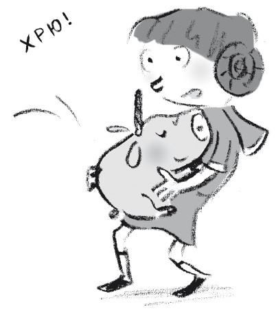 Эмми опустилась на колени и наполнила ведёрко водой. Только она собралась встать, как позади неë возник Профессор Пи и толкнул ведро. Вода с громким «шлëп!» вылилась – и прямо на брюки Эмми.