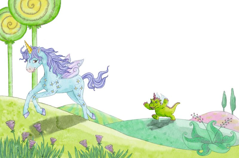 Небесно-голубой единорожка размашистым галопом мчался по Светоострову. За ним по пятам следовал его друг, маленький зелёный огнедышащий дракончик. Грызунчик то заливался смехом, то урчал, то пыхтел. Приятели договорились, что, когда они играют в догонялки на земле, летать нельзя.