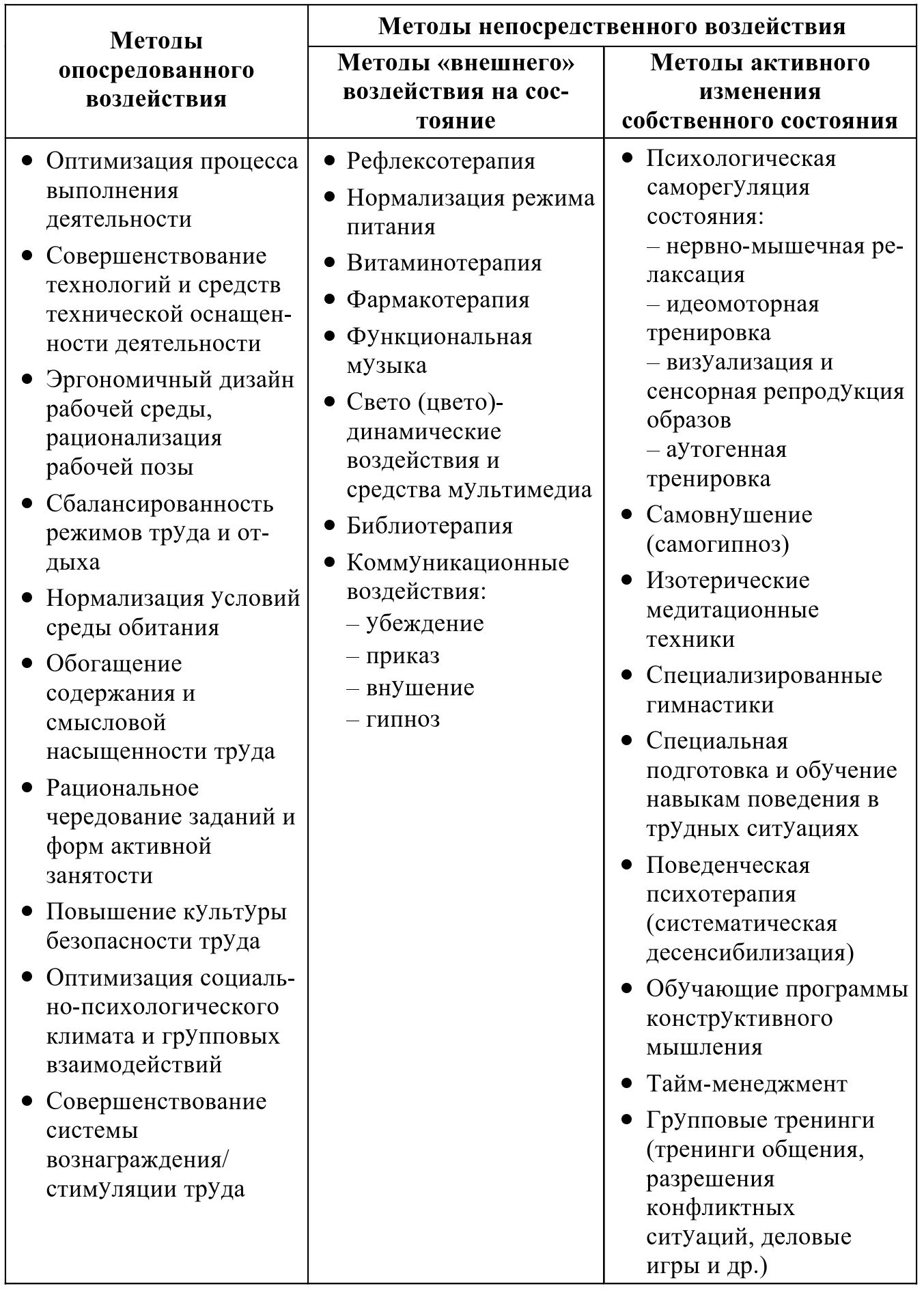 В обобщенном виде предложенная классификация методов профилактики стресса и оптимизации состояний человека представлена в таблице 1. Группа методов опосредованного воздействия, направленных на устранение причин развития негативных состояний, была рассмотрена выше. Поэтому более подробно будут проанализированы методы прямого воздействия, которые составляют основное содержание психопрофилактической работы.