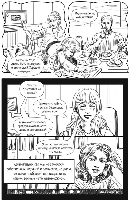 Ответила Амина быстро, уверенно, а я поставила отметки на шкале координат – своеобразном отражении того, где сейчас в своей жизни находится человек и как он себя чувствует. Здоровье, которое человек оценивает на шесть – девять баллов, не мешает ему жить, творить и строить планы на будущее. Порой молодые люди называют цифру четыре и даже знают, какие у них проблемы, но ничего с этим не делают. Тогда я спрашиваю, известно ли им, как поднять эту цифру до восьми. Чаще всего ответ положительный, и тогда я легонько подталкиваю человека, чтобы он с этим не затягивал. Чтобы воплощать мечты, нам нужны физические силы.