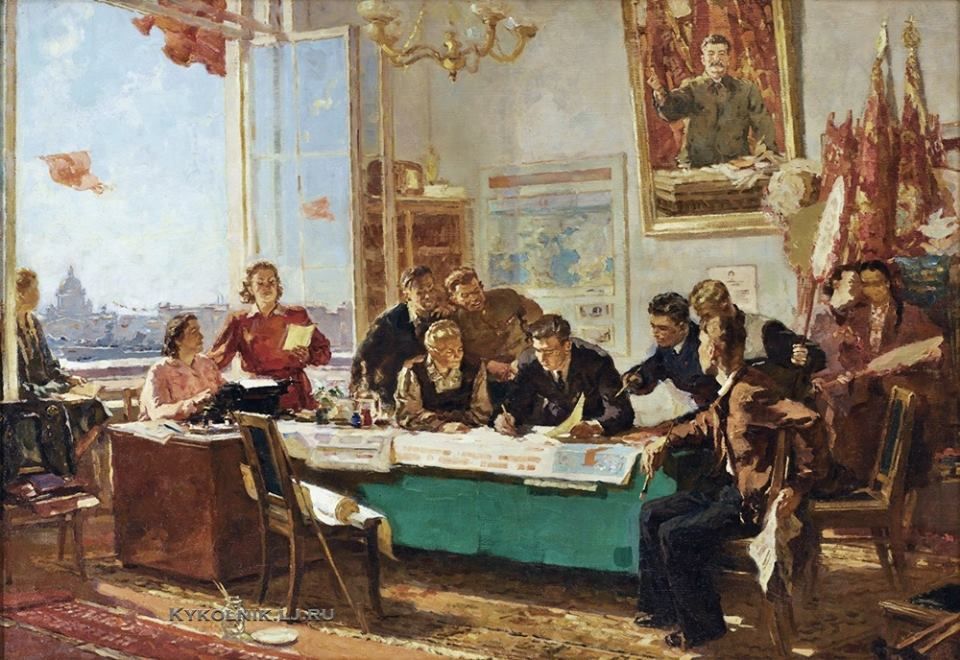 Большая обшарпанная комната, заставленная столами. На стенах портреты вождей. На подоконниках чахлые цветы. Вокруг большого стола в центре сидят участники. Идет заседание отдела.