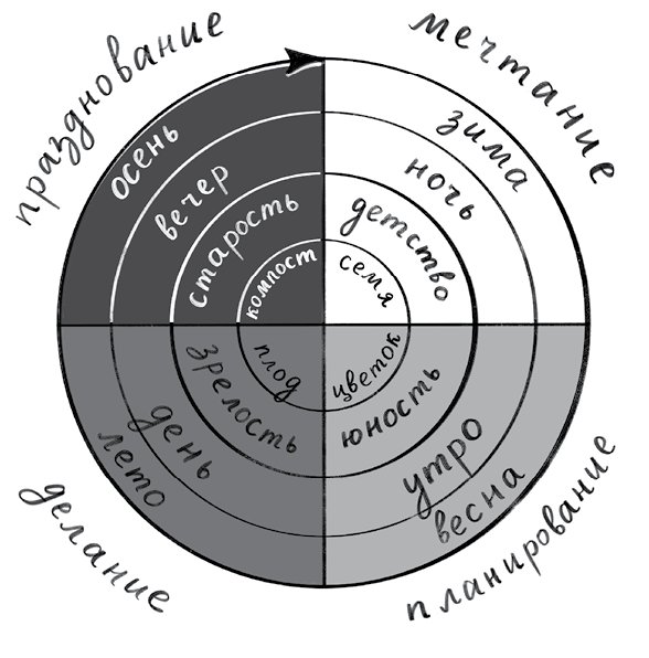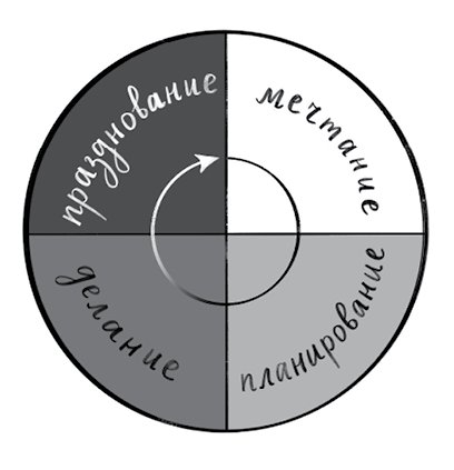 Вся наша жизнь циклична, а цикл – это любой процесс, у которого есть начало, развитие, конец и возможность повторения. День, неделя, месяц, год. Цикл стресса, цикл сна, менструальный цикл. Проект на работе, получение образования, дружеские или деловые отношения, бытовые домашние дела, встречи, реализация идей и многое-многое другое – все это циклы, у которых, присмотревшись, можно обнаружить все те же универсальные стадии: мечтание, планирование, делание и празднование.