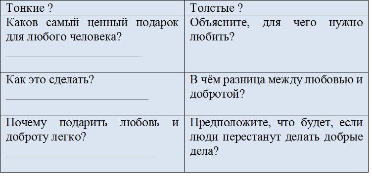 Задание 3. "Тонкие и толстые вопросы": «тонкий» вопрос предполагает однозначный, короткий ответ, а «толстый» (проблемный) требует глубокого осмысления для ответа. Анализируем предыдущий текст «Как проявить любовь и доброту?»