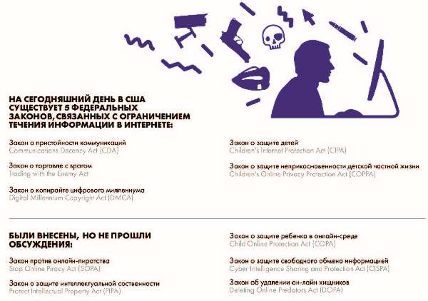 Тем не менее на сегодняшний день в США существует 5 федеральных законов, связанных с ограничением распространения информации в интернете[23]: