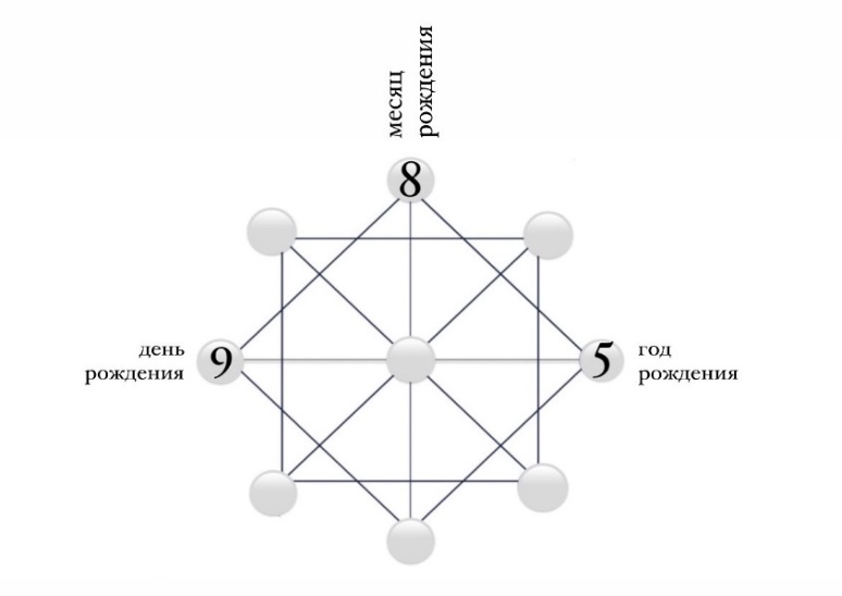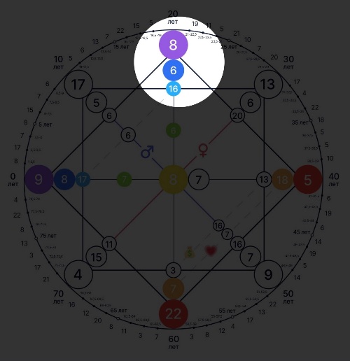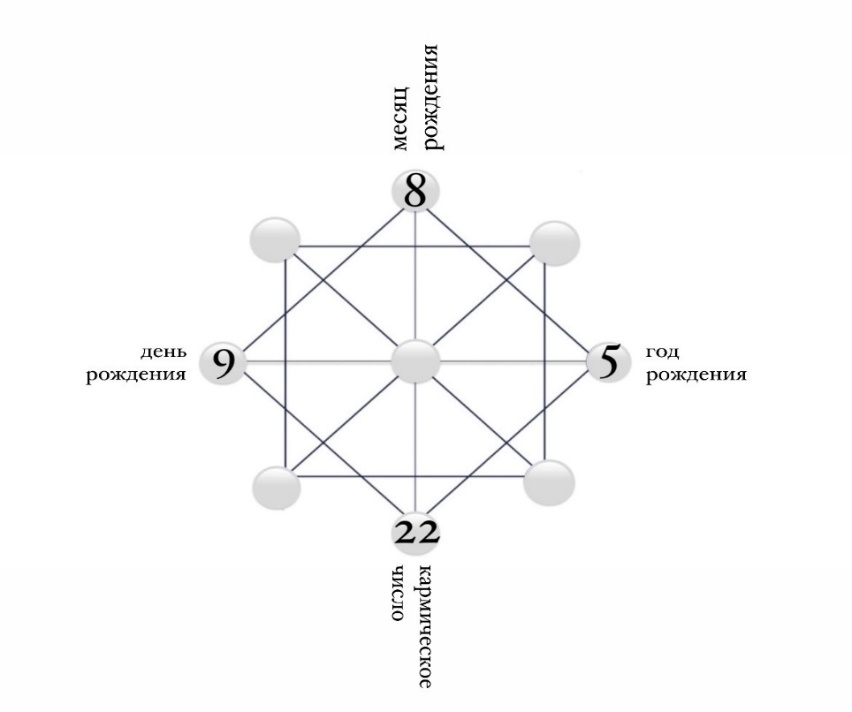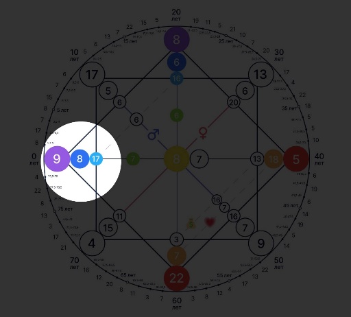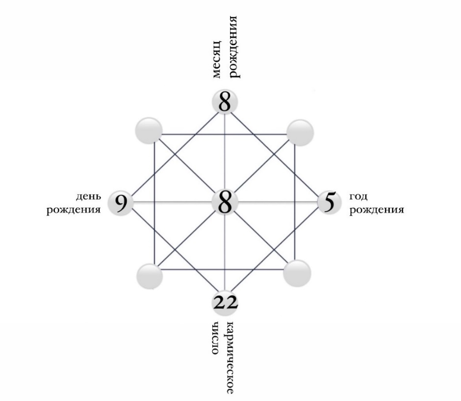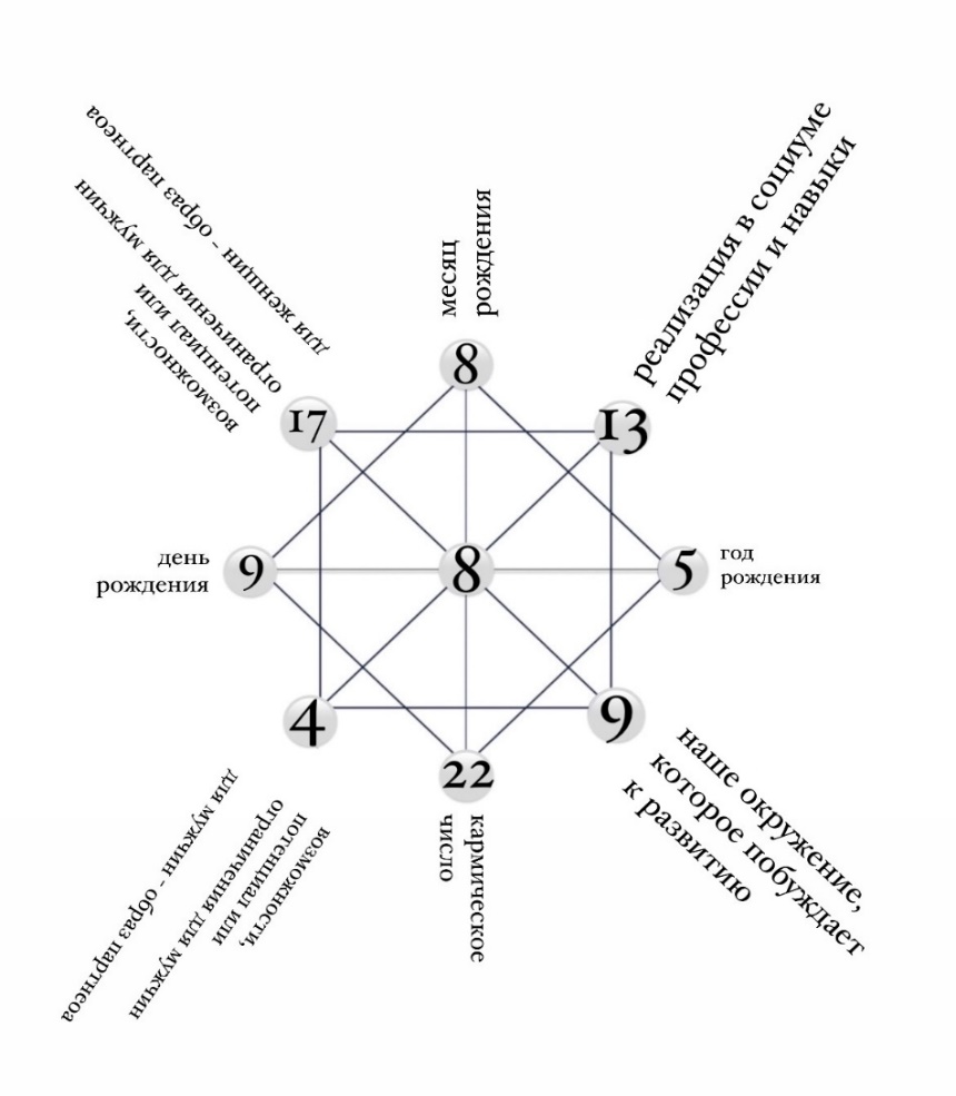 Характер человека, объединяющий все сферы нашей жизни. Чтобы прийти к точке душевного комфорта, необходимо проработать низ матрицы, Кармическую задачу души на это воплощение. В точке душевного комфорта мы гармонизируем все сферы нашей жизни: семья, отношения, финансы, предназначение, таланты, здоровье и наше ресурсное состояние. Просчитывается путем сложения всех уже известных значений. 9+8+5+22=44=4+4=8