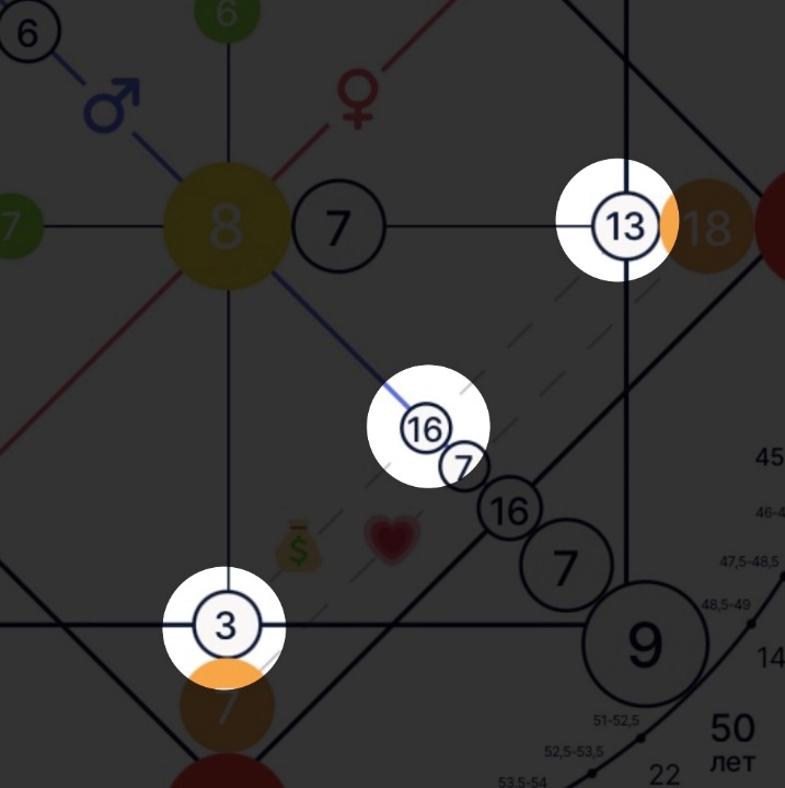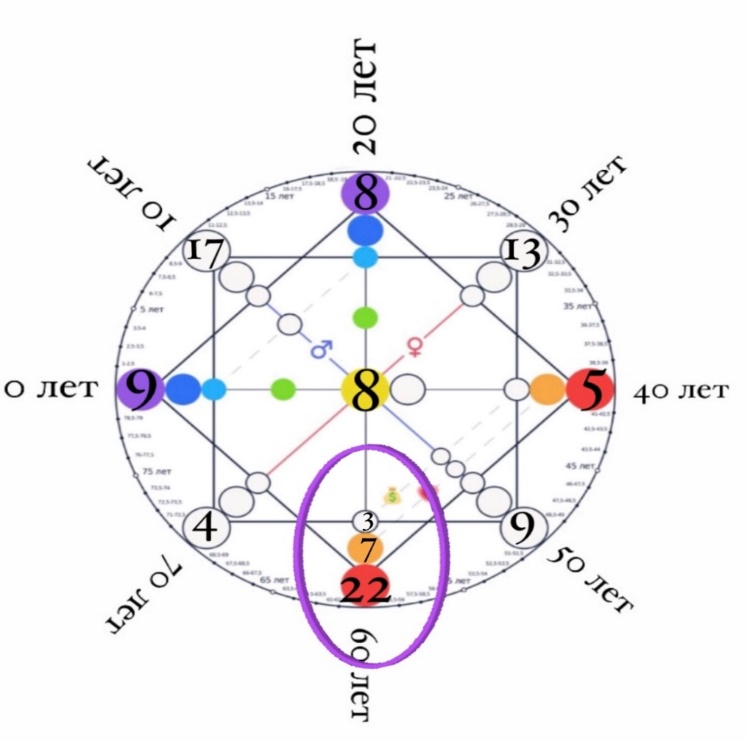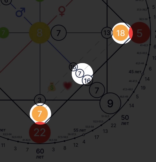 Считаем по алгоритму: Центр + Низ Матрицы = Пересечение линий – 8+22=30=3+0=3(на рисунке прозрачный кружок), затем считаем энергию между ними 22+3=25=2+5=7 (на рисунке оранжевый цвет).