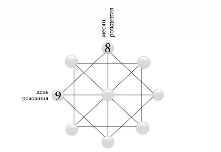 Расчет: Цент Матрицы + День Рождения = Пересечение Линий – 8+9=17(на рисунке голубой цвет), энергия между ними 17+9=26=2+6=8(на рисунке синий цвет)