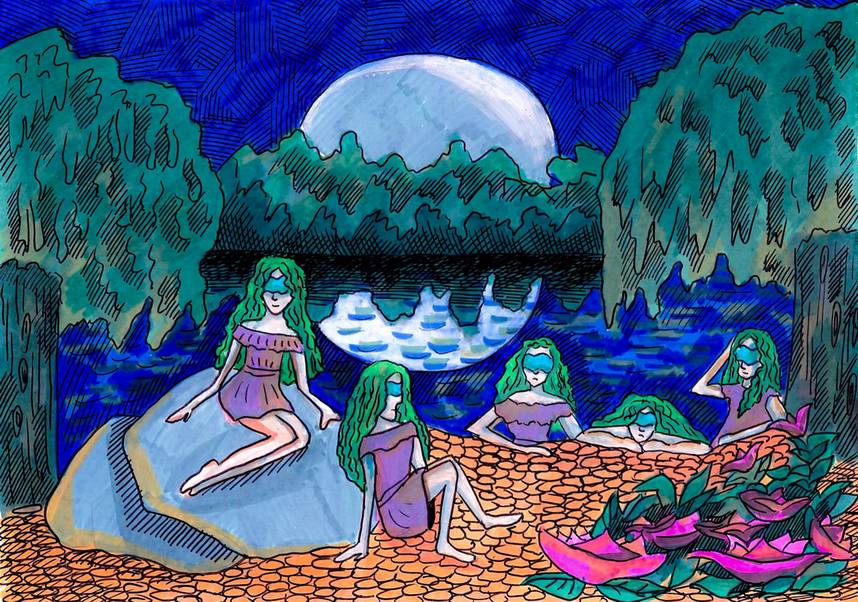 Вдруг, на воде появились круги. Спокойная водная гладь стала вспучиваться и идти большими пузырями, которые в свою очередь стали расти и подниматься вверх водными столбами с человеческими очертаниями. Уже совсем скоро в них можно было различить молодых тонких девушек, укрытых легчайшей водной пеленой, словно тканью. Они выходили из воды и образ их все более прояснялся. Кожа их была прозрачна, будто под ней текла не кровь, а вода. Причём какие-то девушки были более прозрачными, какие-то менее, а какие-то и вовсе почти невидимыми. Волосы их были длинными, скопившими на себе ил и тину, отчего имели зеленоватый оттенок, да и на прозрачных телах их встречались водоросли. Вместо глаз у них была водная гладь, струившаяся ручьями по лицам.