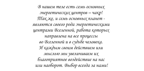 4) Прочитайте информацию о Чакре и сконцентрируйтесь на работе с ней. Проведите Световой настрой, стараясь почувствовать ее вибрацию, или несколько раз прочтите аффирмацию к Чакре, вдумайтесь в нее.