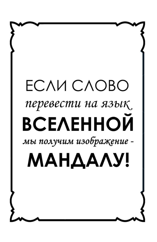 «Если молитву или мантру мы можем слышать только определенный промежуток времени. То если ее перевести на язык Вселенной, мы получим изображение – Мандалу, которая будет работать 24 часа в сутки, 7 дней в неделю, 12 месяцев в году.»