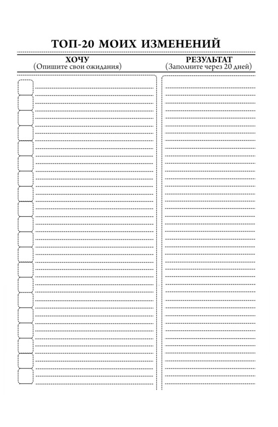 А теперь откройте глаза и запишите все, что вы представили и увидели, все ответы на вопросы в левый столбик таблицы! Помните, пунктов должно быть не меньше 20! Мы уверены, что после такого путешествия в свое будущее, Вы будете готовы написать даже больше!