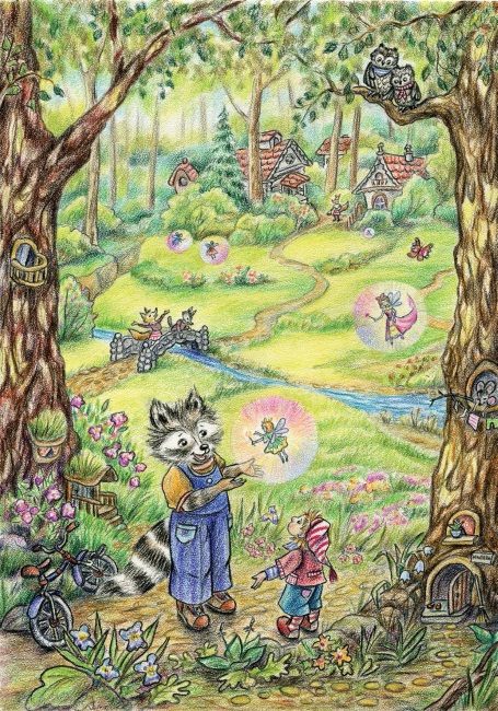 Лес этот необычный. Звери там ходят на задних лапах, одеваются в красивые наряды. Зверята посещают детские садики и школы. Они учатся не только собирать орехи и ягоды, рыть норки и лазить по деревьям, но ещё читать, писать и считать, замечать прекрасное и мечтать. Волчата дружат с зайчатами, ведь в Волшебном лесу никто никого не ест. Кроме зверей там живут весёлые гномики и маленькие феи.