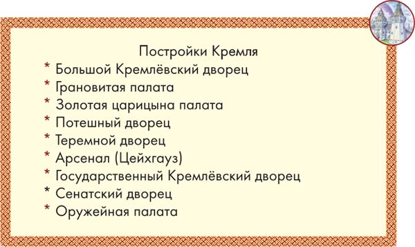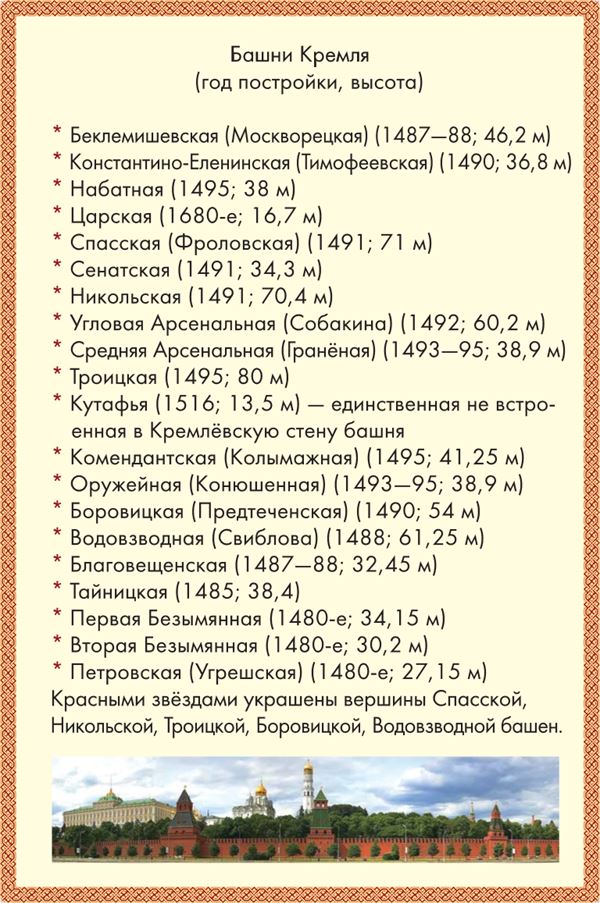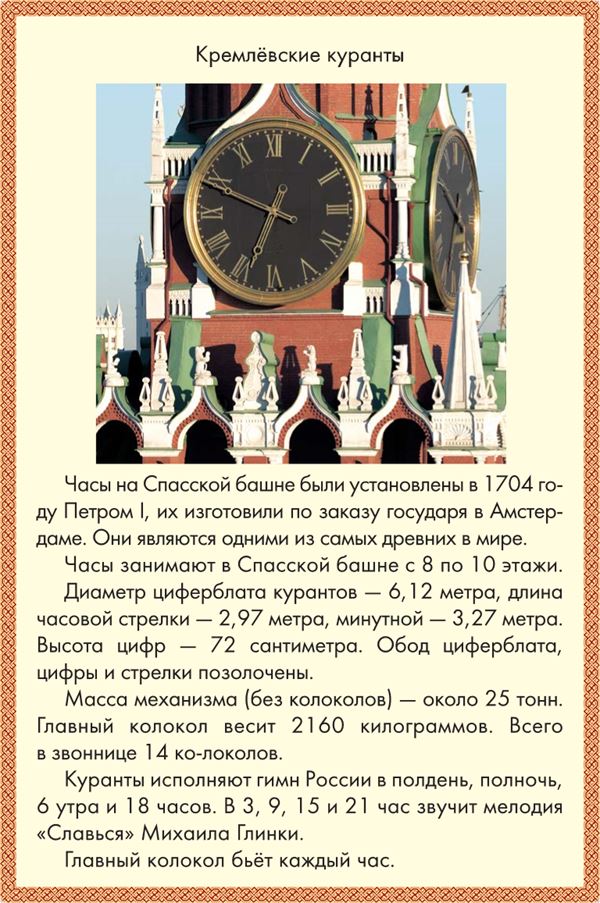– Башен в моём Кремле двадцать! – гордо сказала Москва. – Одна из них, Спасская, украшена огромными часами – курантами.