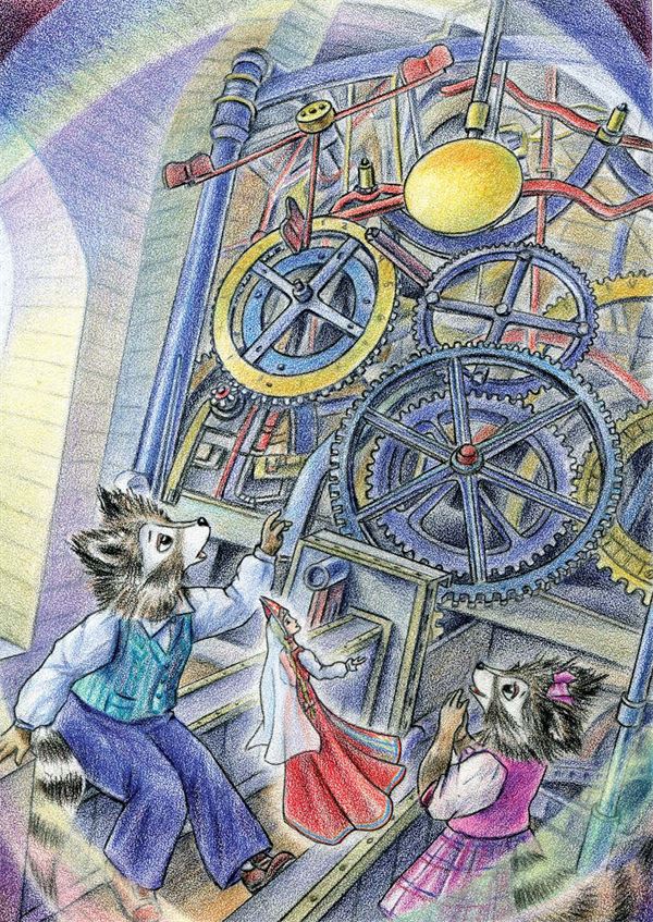 – Тогда вперёд, в настоящее! – Шагнув в книгу, енотики опять очутились у красной кирпичной стены рядом с башней с большими круглыми часами.
