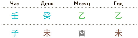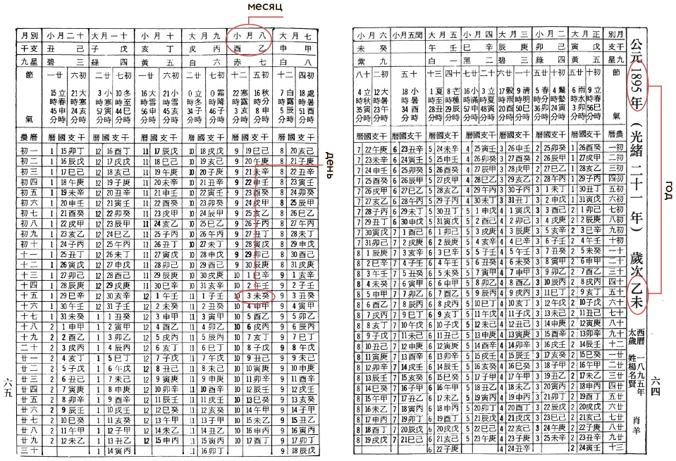 Ниже – пример разворота китайского календаря на 1895 год. Китайские календари, как правило, столетние, издаются на длительный срок, так чтобы пользоваться ими можно было длительное время. Из китайского календаря мы можем взять данные о том, какие стихии наполняют карту рождения по году, месяцу и дню (см. рис. выше). Берем иероглифы Небесных стволов и Земных ветвей из календаря и подставляем их в таблицу Четырех столпов. Поскольку у китайцев принято читать справа налево и сверху вниз, то расположение иероглифов в таблице будет соответствующим: справа налево и сверху вниз.