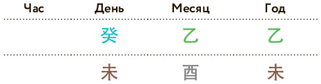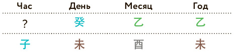 Здесь я хочу обратить внимание, что, даже если время рождения неизвестно, то система бацзы все еще позволяет сделать хотя и не полный, но все равно достаточно емкий анализ карты жизни человека на основании данных остальных трех столпов. Во многих других астрологических системах карты без данных о часе рождения приходится строить на условное время, например на 12:00, что искажает точку отсчета. В бацзы же мы имеем целых три столпа из четырех для анализа.