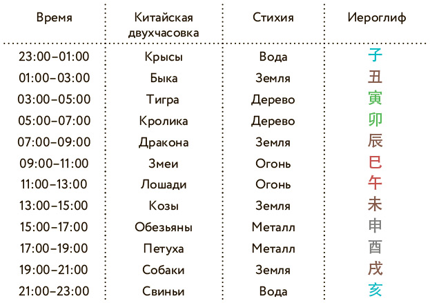 Осталось заполнить столбец часа. Для этого используем таблицу китайских «двухчасовок», или сдвоенных часов. По ней мы определим Земную ветвь часа. Китайские двучасия, или двухчасовки, – это сдвоенные часы в сутках, каждый из которых соответствует той или иной Земной ветви, представленной животным.
