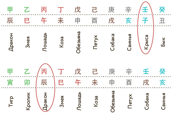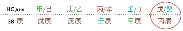 НС – Небесный ствол; ЗВ – Земная ветвь. По ней определяется Небесный ствол Земной ветви Дракона, ближайшей к искомому Небесному стволу часа, и, двигаясь в таблице по двенадцати Земным ветвям в строках 60 Цзя Цзы (в этом случае назад, поскольку Земная ветвь Крысы находится перед Земной ветвью Дракона), мы находим Небесный ствол часа – это Вода Ян 壬.
