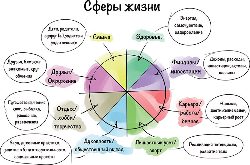 Очень большое внимание надо уделять тому, на ЧТО ты его расходуешь, ведь даже купленное время можно потратить не на то, что дает тебе результат. Есть такой инструмент – «колесо баланса жизни», когда ты расписываешь все направления, из чего состоит твоя жизнь, и распределяешь время между этими направлениями. Если на какую-то сферу ты не выделяешь время, то колесо/жизнь начинает ехать криво. Ниже – пример распределения сфер жизни. Сферы жизни ты можешь написать не как в примере, а по-своему разделить. Например, кто-то личный рост и духовность объединяет, а кто-то убирает духовность и добавляет религию, а у некоторых отдых и хобби разделены (например, рыбалка – это прямо отдельное направление-хобби, на которое человек тратит много времени).