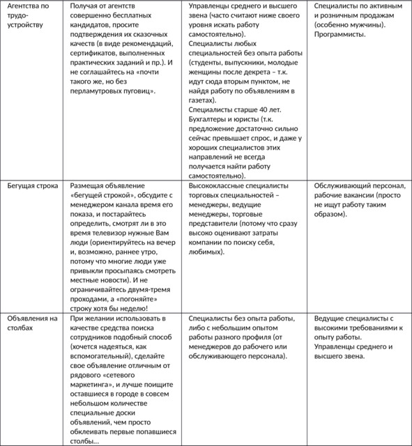 По мере анализа источников поиска персонала, Юлий быстро понял, что направлений поиска соискателем и организацией друг друга, по сути, существует два, точнее, два с половиной. Первый – инициатива соискателя (расположение своего резюме на работных сайтах, в соцсетях или его публикация в газете (так тоже бывает и по сей день, а в те исторические времена было чуть ли не главным источником поиска работы), а также пилотные обзвоны всех без исключения организаций с интересующей спецификой, что встречается реже, но все-таки встречается). Второй – инициатива работодателя, которая более широко вариативна – от развешивания объявлений на столбах до выкупа интересующих сотрудников у клиентов, поставщиков, дочерних компаний (вот так, крепостное право XXI века!). И, наконец, половинка – это инициатива посредника (чаще всего кадрового агентства), которая и является половинчатой, так как базируется все равно на чьем-то первом шаге (обращении одной, либо другой стороны, с запросом).