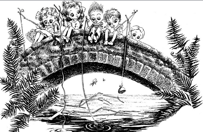Тропинка, ведущая от дома, забиралась в заросли высоких папоротников и вела прямо к мосту через речку – древнему, каменному, покрытому зеленым бархатистым мхом. На его перилах Алиска рассадила кукол с удочками.