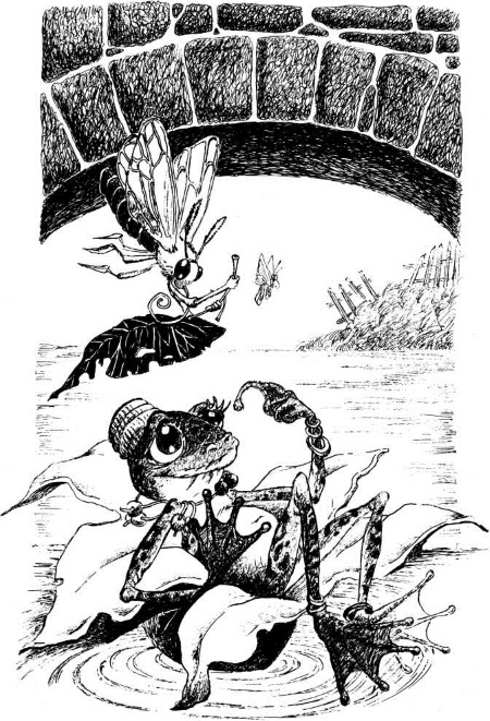 Из-под моста, покачиваясь на волнах, выплыл белый цветок, похожий на огромную кувшинку. На нем возлежал лягушачий Принц, укрывшийся зеленым листом, будто зонтиком. Над ним порхали белые мотыльки, навевая ветерок и прохладу. Из-под цветка виднелись извивающиеся хвостики пиявок-охранников.