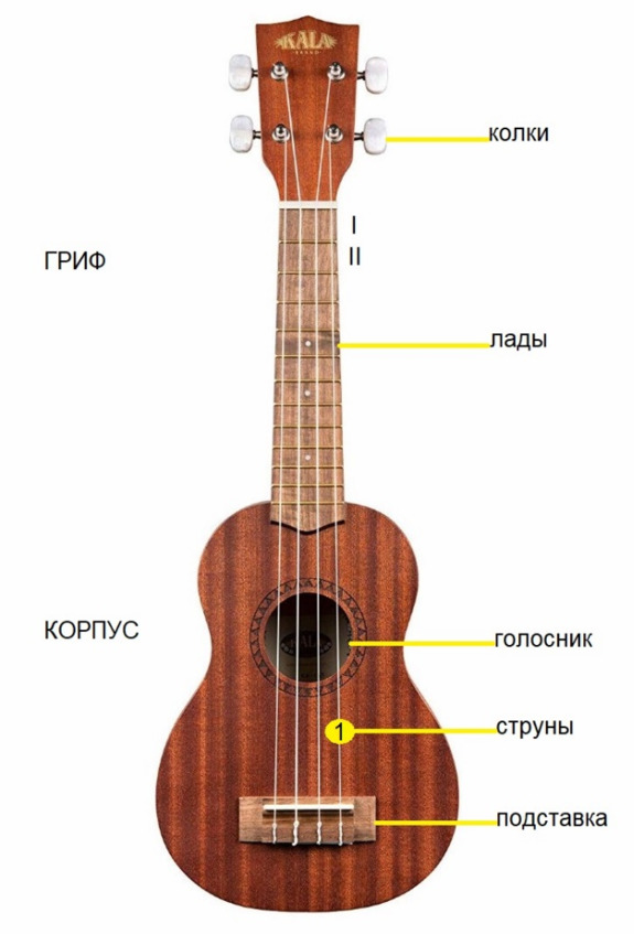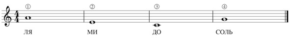 1-я струна – ля первой октавы,2-я струна – ми первой октавы,3-я струна – до первой октавы,4-я струна – соль первой октавы.