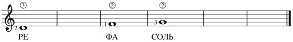 Нота РЕ зажимается 2-ым пальцем на II ладу 3-й струны.Нота ФА зажимается 1-ым пальцем на I ладу 2-ой струны.Ноту СОЛЬ можно извлечь, зажав III лад 2-ой струны.